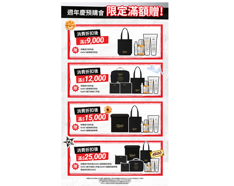 百货预购会不可错过的当然有满额赠:你搭捷运时一定看过有人背Kiehl’s包吧! 怎么背怎么潮!今年全新回归最潮週边经典托特包、旅行收纳三件组、摺叠收纳椅凳买槛满额都有不同选择,再搭上超值豪华旅行组一起送给你!
